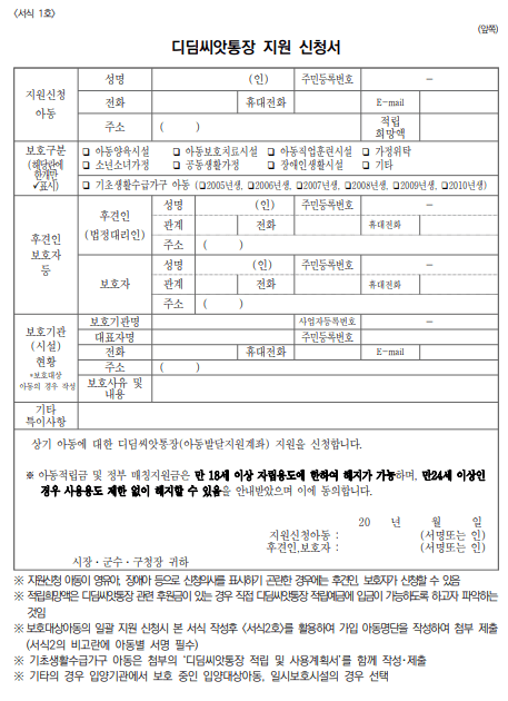신청서 작성 : 디딤씨앗통장 지원 신청서를 작성해야 합니다. 이 신청서에는 아동의 개인정보와 가정의 소득 정보가 포함되어야 합니다.